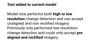 One of the very pertinent things we did for this project is improve upon the GA-CCRi tool by modifying it to accept inputs from any satellite and detect change in images that were not prealigned with eachother. The tool that was already available was too limiting because it could only accept LandSat imagery as input and the images had to be orthorectified and aligned prior to their use. This is unrealistic given the fact that most satellite imagery is captured off-NADIR or at an angle.